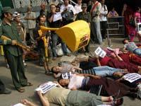 Demonstrators called on the company to immediately withdraw from Tibet, as shareholders and executives of China Gold gathered to finalize the acquisition of a copper mine in Gyama close to Lhasa, Tibet’s capital.
